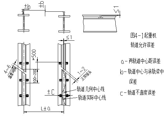 ⑤两轨道中必(跨度)轨道中心与承梁中心、轨道不直度误差(图4—1)不得超过表3—1的规定。