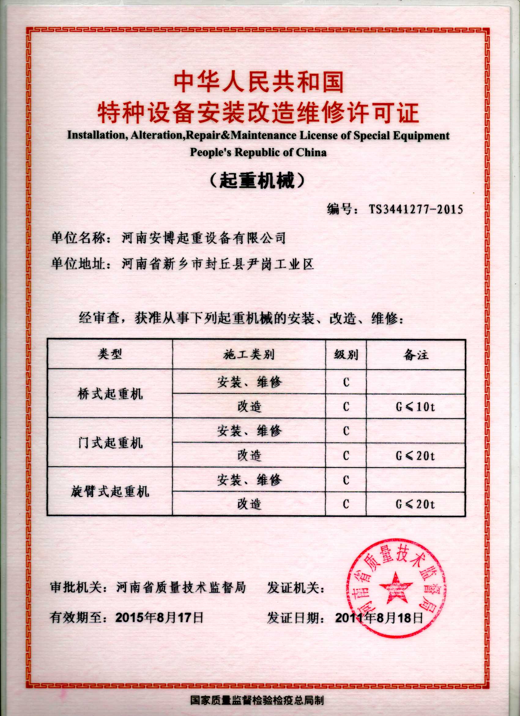 河南安博起重设备有限公司,地处新乡市尹岗工业区,现有职工500人,管理人员50人,占地面积7800平方米,固定资产700万元,是生产起重设备的先进企业之一,市级“产品质量服务双优企业”、“AAA级企业”、“质量信得过企业”等先进企业。