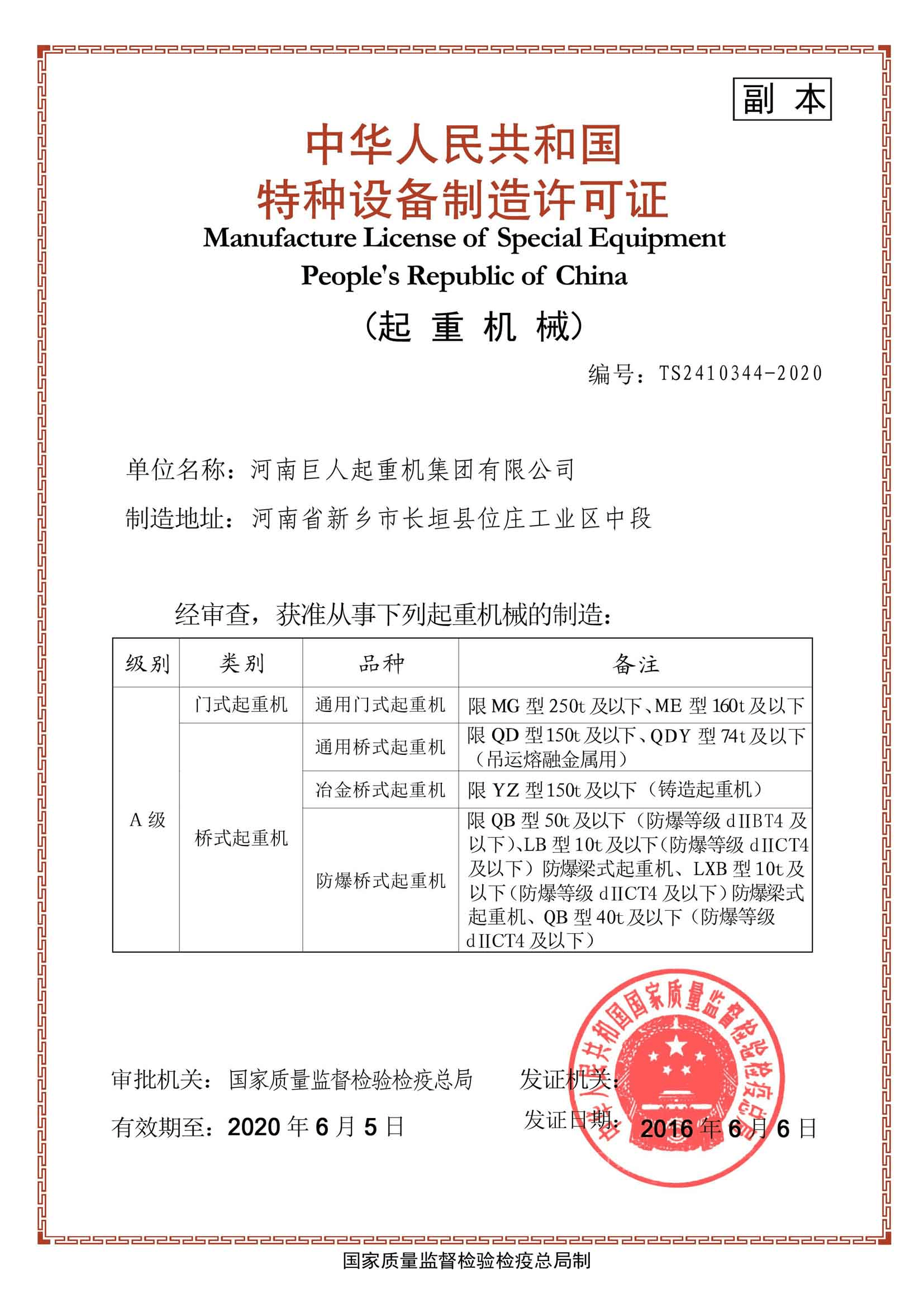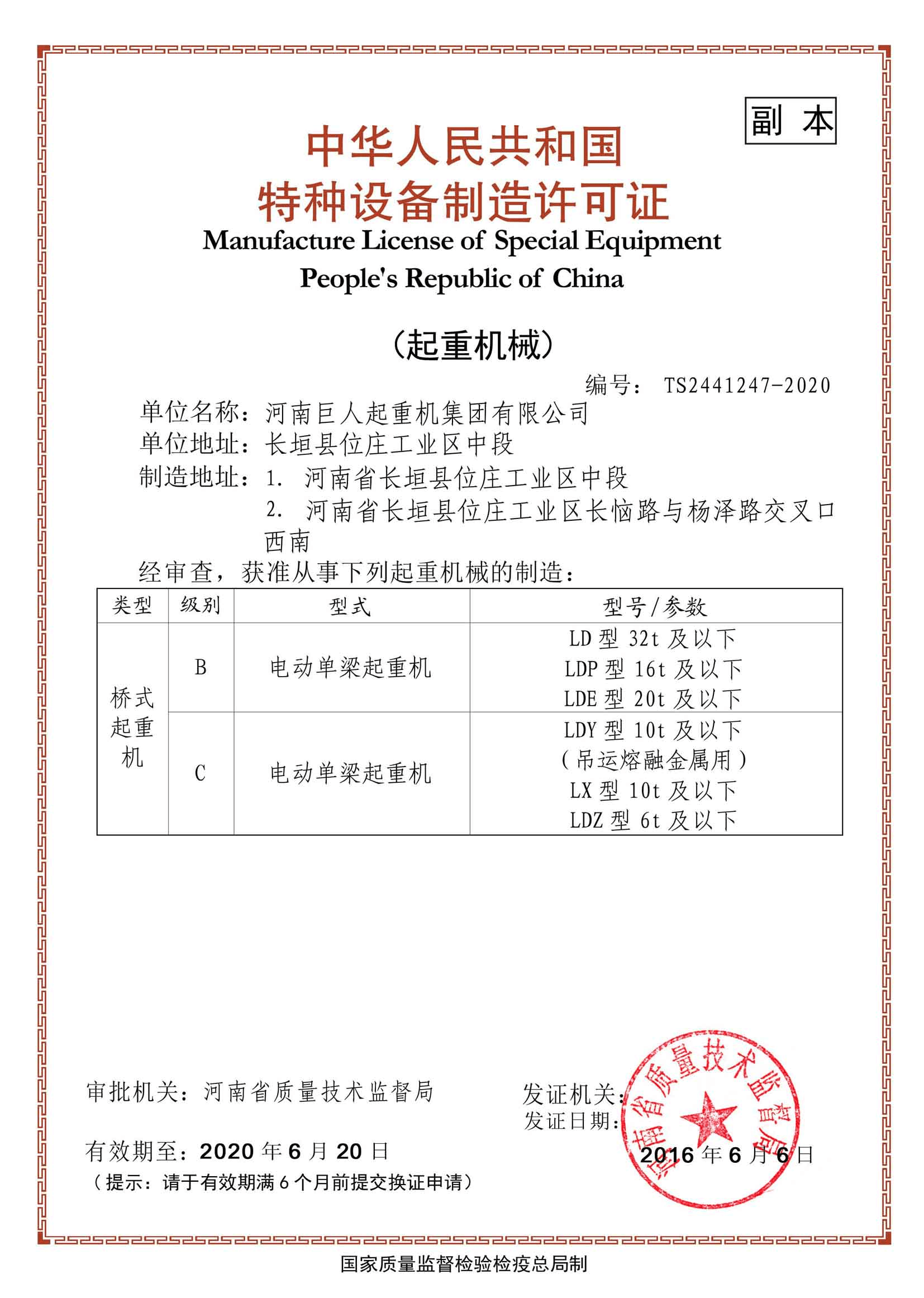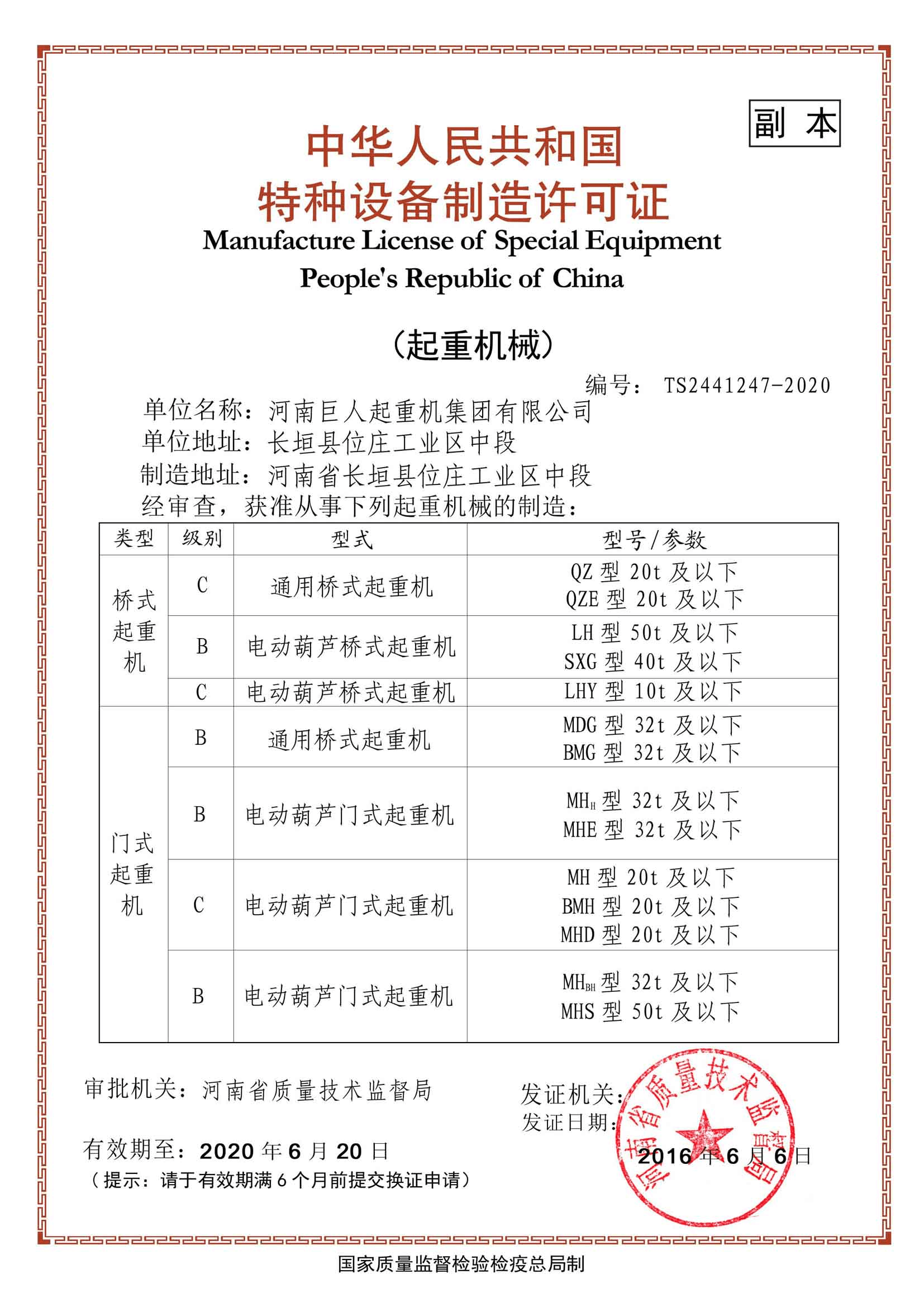 河南巨人起重机集团有限公司始建于1987年,注册资金1.2亿元,现有4个厂区,总占地面积46.6万平方米,固定资产2亿元,各种生产加工设备2000余台、套,现有员工1500人,其中,中、专业技术管理人员230人,本公司产品先后获得国家质量监督检验疫检疫总局颁发的中华人民共和国特种设备制造许可证、ISO9001、2000国际质量管理体系认证。防爆合格证,中华人民共和国特种设备安装改造、维修许可证。国家质量监督检验检疫体系认证和全国起重机械产品型号认可证书,本公司致力于欧式起重机技术的创新和发展,努力把公司的产品打造成国内、国际知名品牌。
