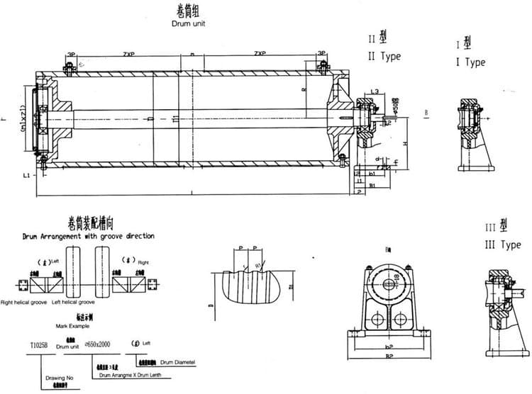 2.卷筒组的结构:卷筒组主要由卷筒、卷筒轴、齿轮盘接手(或大齿轮)、卷筒毂、轴承体和轴承组成。按结构形式分类主要分为带齿轮盘接手卷筒和带大齿轮卷筒,这两种产品的特点是卷筒轴只承受弯曲力矩。在卷筒上装备有上升限位开关时,应该在卷筒毂和轴安装键联接,才能保证卷筒与卷筒轴同步旋转。